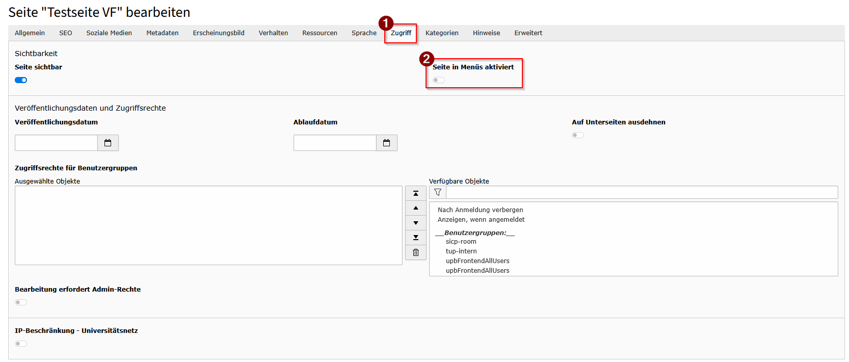 Screenshot TYPO3 – Burger-Menü: Funktion "in Menüs aktivieren" in den Seiteneigenschaften.
