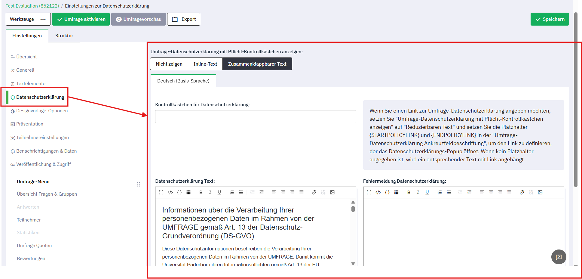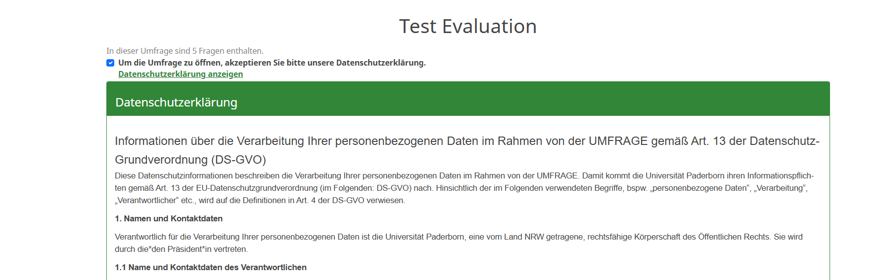 Der folgende Text kann als Vorlage im Feld „Datenschutzerklärung Text“ verwendet werden und muss je nach Umfrage angepasst werden. Die rechtliche Verantwortung für die inhaltliche Richtigkeit liegt bei den Umfrageersteller/innen.