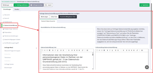 LimeSurvey verfügt über eine integrierte Funktion zur Anzeige eines Datenschutzhinweises, der vor Beginn der Umfrage angezeigt und von Teilnehmenden akzeptiert werden muss. Diese Einstellungen finden Sie in den Umfrage-Einstellungen unter „Datenschutzerklärung“.