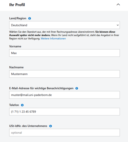- Füllen Sie die Profilinformationen aus.