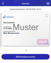 | 16:12, 9. Okt. 2025 | Dienstausweis-Mitarbeitende-02.png (Datei) | 88 KB | {{Information | description = Screenshot UPB-App - Studierendenausweis und Dienstausweis | source = Screenshot | date = 09.10.2025 | author = Benutzer:jnk | permission = {{PD-user|jnk}} }}Kategorie:Screenshots | 2 | |