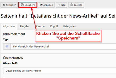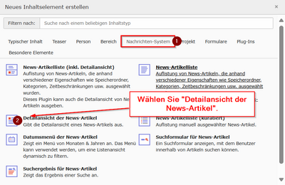 - Seite öffnen → + Inhalt → „Nachrichten-System“ → „Detailansicht der News-Artikel“ auswählen.