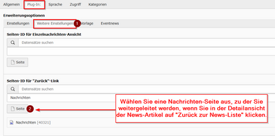 - Wählen Sie im Abschnitt 'Seiten-ID für "Zurück"-Link' die Seite aus, zu der Sie weitergeleitet werden, wenn Sie in der Detailansicht der News-Artikel auf "Zurück zur News-Liste" klicken. Dies kann leer bleiben, wenn Sie keinen Link für "Zurück zur News-Liste" in der Detailansicht der News-Artikel haben möchten.