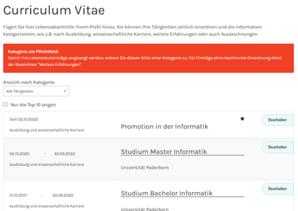 Der Personenmanager erlaubt es, den eigenen Lebenslauf zu hinterlegen, so dass er auf den Universitäts Webseiten bequem als Vita-Information erscheint. Sie können Ihre Daten jederzeit nachträglich bearbeiten und Einträge hinzufügen oder entfernen.