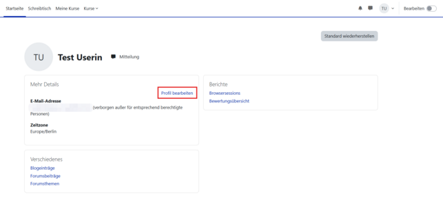 | − | Nachdem "Profil" im Dropdown Menü ausgewählt wurde, wird im nächsten Schritt '''„Profil bearbeiten“ (1)''' angeklickt. | + | Nachdem "Profil" im Dropdown Menü rechts oben neben Ihrem Namen ausgewählt wurde, wird im nächsten Schritt '''„Profil bearbeiten“ (1)''' angeklickt. |