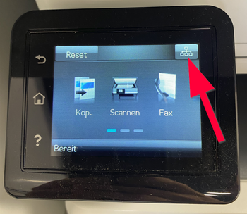 Drucker haben in der Regel einen Shortcut auf dem Startbildschirm, der auf eine Infoseite führt. Dieser kann durch eine Netzwerksymbol 🖧 oder ein i 🛈 gekennzeichnet sein.