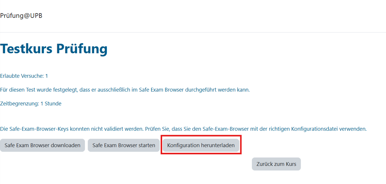Sie können die Prüfung entweder über die Schaltfläche "Safe Exam Browser starten" beginnen oder indem Sie die Konfigurationsdatei für die Prüfung herunterladen – diese wird Ihnen entweder