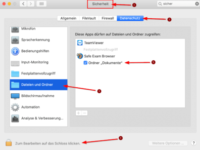 | + | [[Datei:SafeExamBrowser-8.png|mini|396x396px| Unter - Systemeinstellungen / Sicherheit / Datenschutz /Dateien und Ordner - lässt sich die Berechtigung hinzufügen.|alternativtext=|ohne]] | ||