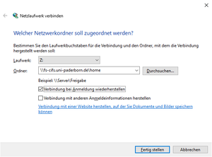* Laufwerk: Z: (oder wählen Sie einen beliebigen anderen, noch nicht genutzten Laufwerkbuchstaben aus) | * Laufwerk: Z: (oder wählen Sie einen beliebigen anderen, noch nicht genutzten Laufwerkbuchstaben aus) | ||