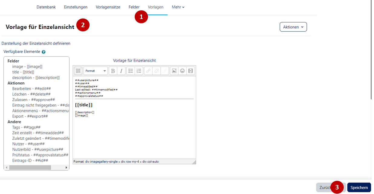 | aktuell | 12:28, 23. Jul. 2025 | 877 × 667 (147 KB) | Mfunk (Diskussion | Beiträge) | {{Information | description = Screenshot Moodle Datenbank Vorlagensatz bearbeiten | source = Screenshot | date = 23.07.2025 | author = Benutzer:mfunk | permission = {{PD-user|mfunk}} }}Kategorie:Screenshots | |