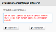 | 07:59, 14. Okt. 2016 | Screenshot Serviceportal - Urlaubsbenachrichtigung 02.png (Datei) | 8 KB | {{Information | description = Screenshot Urlaubsbenachrichtigung | source = Screenshot | date = 14.10.2016 | author = Benutzer:beyonder | permission = {{PD-user|beyonder}} }}Kategorie:Screenshots | 1 | |