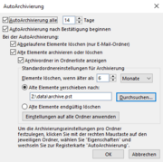 | 11:53, 9. Sep. 2022 | Autoarchivierung mit outlook 05.png (Datei) | 16 KB | {{Information | description = Screenshot Outlook unter Windows 10 - AutoArchivierung im Netzwerkspeicher | source = Screenshot | date = 09.09.2022 | author = Benutzer:jnk | permission = {{PD-user|jnk}} }}Kategorie:Screenshots | 1 | |