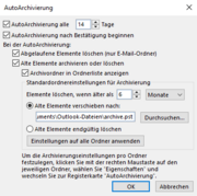 | 11:52, 9. Sep. 2022 | Autoarchivierung mit outlook 03.png (Datei) | 24 KB | {{Information | description = Screenshot Outlook unter Windows 10 - AutoArchivierung lokal | source = Screenshot | date = 09.09.2022 | author = Benutzer:jnk | permission = {{PD-user|jnk}} }}Kategorie:Screenshots | 1 | |