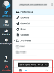 | 11:59, 26. Aug. 2022 | Webmail Quota.png (Datei) | 21 KB | {{Information | description = Screenshot aus Roundcube - Speicherplatzanzeige | source = Screenshot | date = 26.08.2022 | author = Benutzer:jnk | permission = {{PD-user|jnk}} }}Kategorie:Screenshots | 2 | |