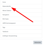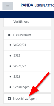 | 09:22, 6. Okt. 2022 | Panda-Kurs-Materialkoffer-01.png (Datei) | 11 KB | {{Information | description = Screenshot PANDA - Block hinzufügen | source = Screenshot | date = 06.10.2022 | author = Benutzer:jnk | permission = {{PD-user|jnk}} }}Kategorie:Screenshots | 1 | |