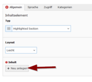 | 11:41, 15. Dez. 2023 | Typo3-highlighted-section-03.png (Datei) | 9 KB | {{Information | description = Screenshot TYPO3 - Inhaltselement Highlighted Section einfügen | source = Screenshot | date = 15.12.2023 | author = Benutzer:jnk | permission = {{PD-user|jnk}} }}Kategorie:Screenshots | 1 | |