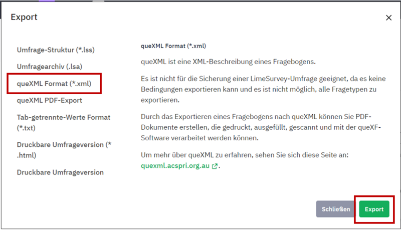 | Description | Screenshot of Limesurvey Exportformat queXML Format |