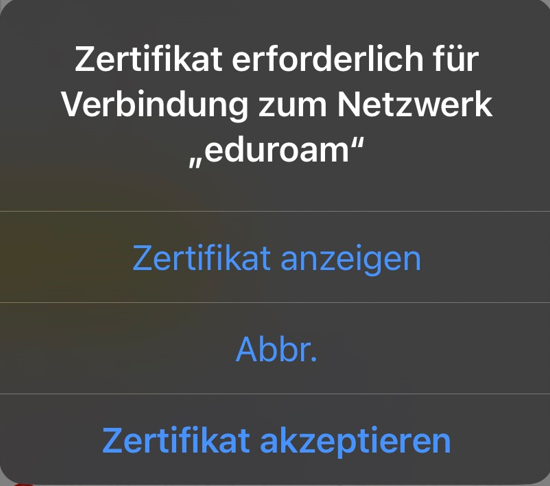 | Description | Screenshot iOS - Warnung nach Wechsel Zertifikat Radius Server |
