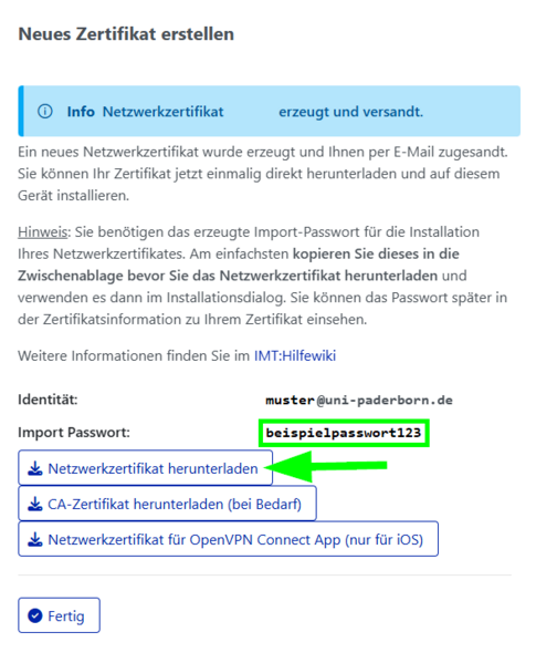 | Description | Screenshot Serviceportal - Import-Passwort kopieren und Netzwerkzertifikat herunterladen |