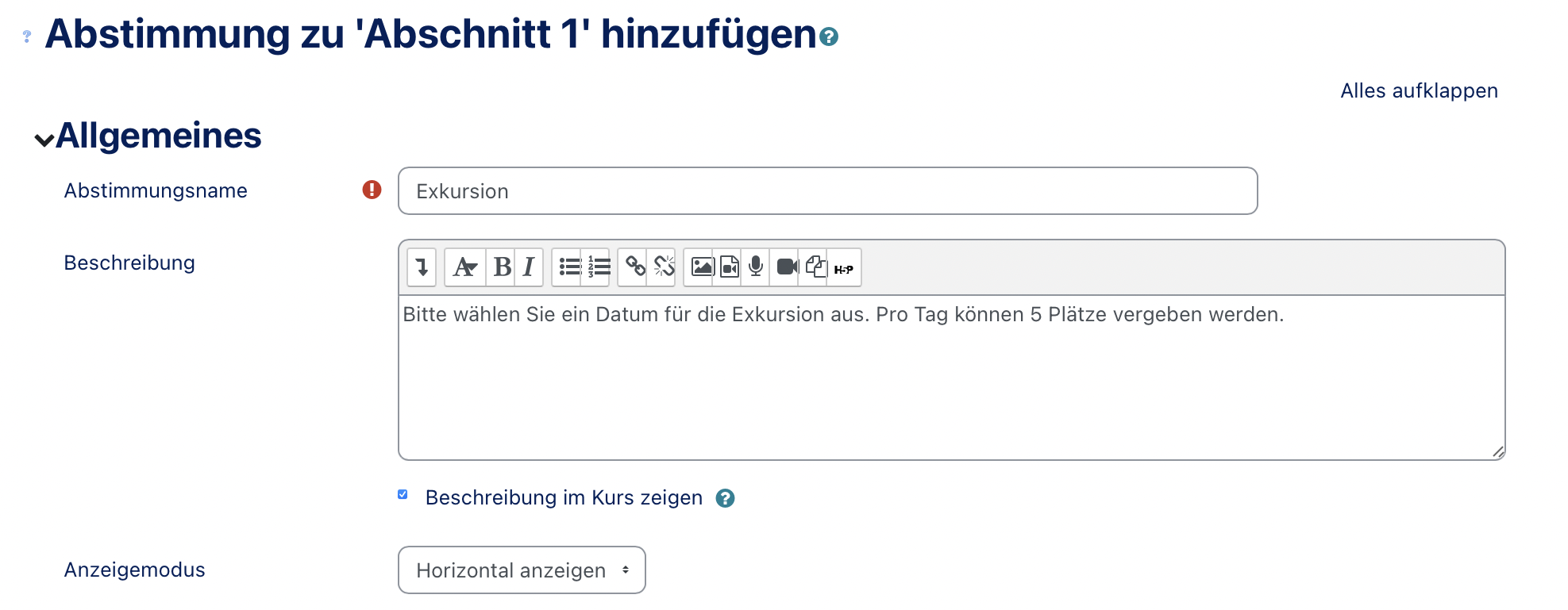 aktuell08:59, 22. Jul. 2025Vorschaubild der Version vom 08:59, 22. Jul. 20251.408 × 672 (58 KB)Mfunk (Diskussion | Beiträge){{Information | description = Screenshot Moodle Abstimmung Grundeinträge | source = Screenshot | date = 22.07.2025 | author = Benutzer:mfunk | permission = {{PD-user|mfunk}} }}Kategorie:Screenshots