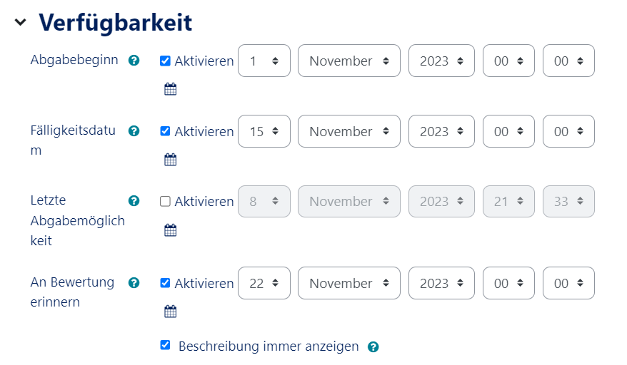 | Description | Screenshot Aufgabe Einstellungen Verfügbarkeit |