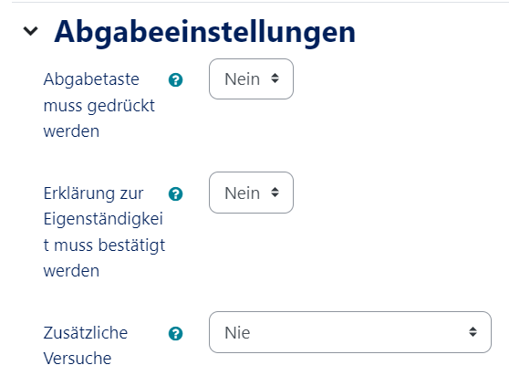 22:07, 8. Nov. 2023Vorschaubild der Version vom 22:07, 8. Nov. 2023558 × 423 (23 KB)Mfunk (Diskussion | Beiträge){{Information | description = Screenshot Aufgabe Einstellungen Abgabeeinstellungen | source = Screenshot | date = 08.11.2023 | author = Benutzer:mfunk | permission = {{PD-user|mfunk}} }}Kategorie:Screenshots