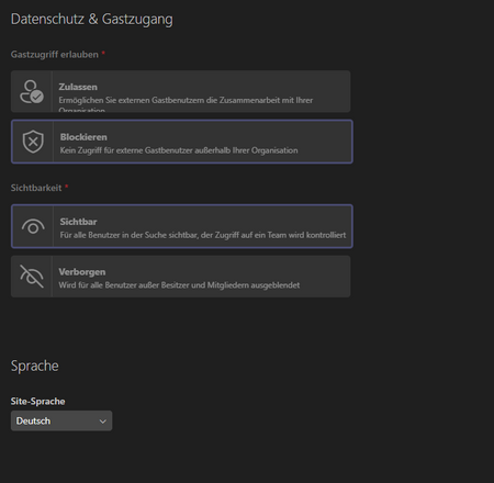 Abhängig von der Auswahl der SharePoint Seite (Projekt/Abteilung haben Sie nun die Möglichkeit den Gastugriff und die Sichtbarkeit der Seite zu konfigurieren.