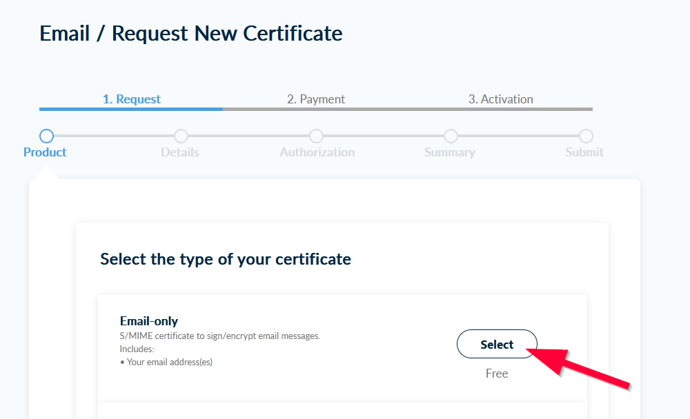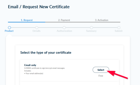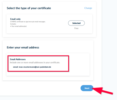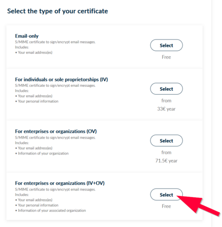 • Studierende wählen das "Email-only" Zertifikat aus und klicken dort auf Select.