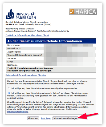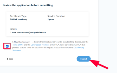 • Sie sehen nun eine Auflistung der Daten, die an HARICA übermittelt werden.