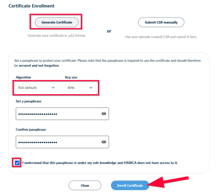 • Notieren Sie dieses Passwort an einem sicheren Ort. Sie können das Passwort später nicht ändern und nicht zurücksetzen. Weder HARICA noch das ZIM kann Ihnen dabei helfen. Setzen Sie den Haken, wenn Sie dies verstanden haben.