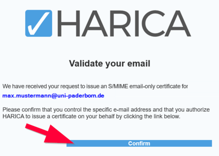 • Falls der Link Sie nicht automatisch zu diesem Bildschirm leitet, können Sie sich nochmals mit dem Identity Provider bei HARICA anmelden. In der E-Mail finden Sie einen Link, den Sie manuell kopieren können, falls es nicht automatisch funktioniert. Diesen fügen Sie dann einfach in dem Fenster, in welchem Sie sich angemeldet haben, oben anstelle der dort stehenden Webadresse ein. Dann sollten Sie auf "Confirm" klicken könnnen.