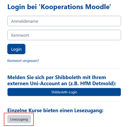Wenn Sie mit Lesezugang auf einen Kurs zugreifen wollen, muss der Lesezugang für diesen Kurs freigegeben worden sein. Einen Link zum Kurs erhalten Sie in der Regel direkt von den Kursverantwortlichen. Über die Login-Seite können Sie sich über die Schaltfläche "Lesezugang" anmelden.